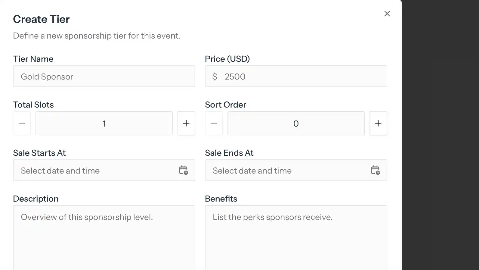 Build tiers with a name, description, benefits, pricing, and quantity. Add sale windows and use the Featured or Public flags to highlight your most important packages.
